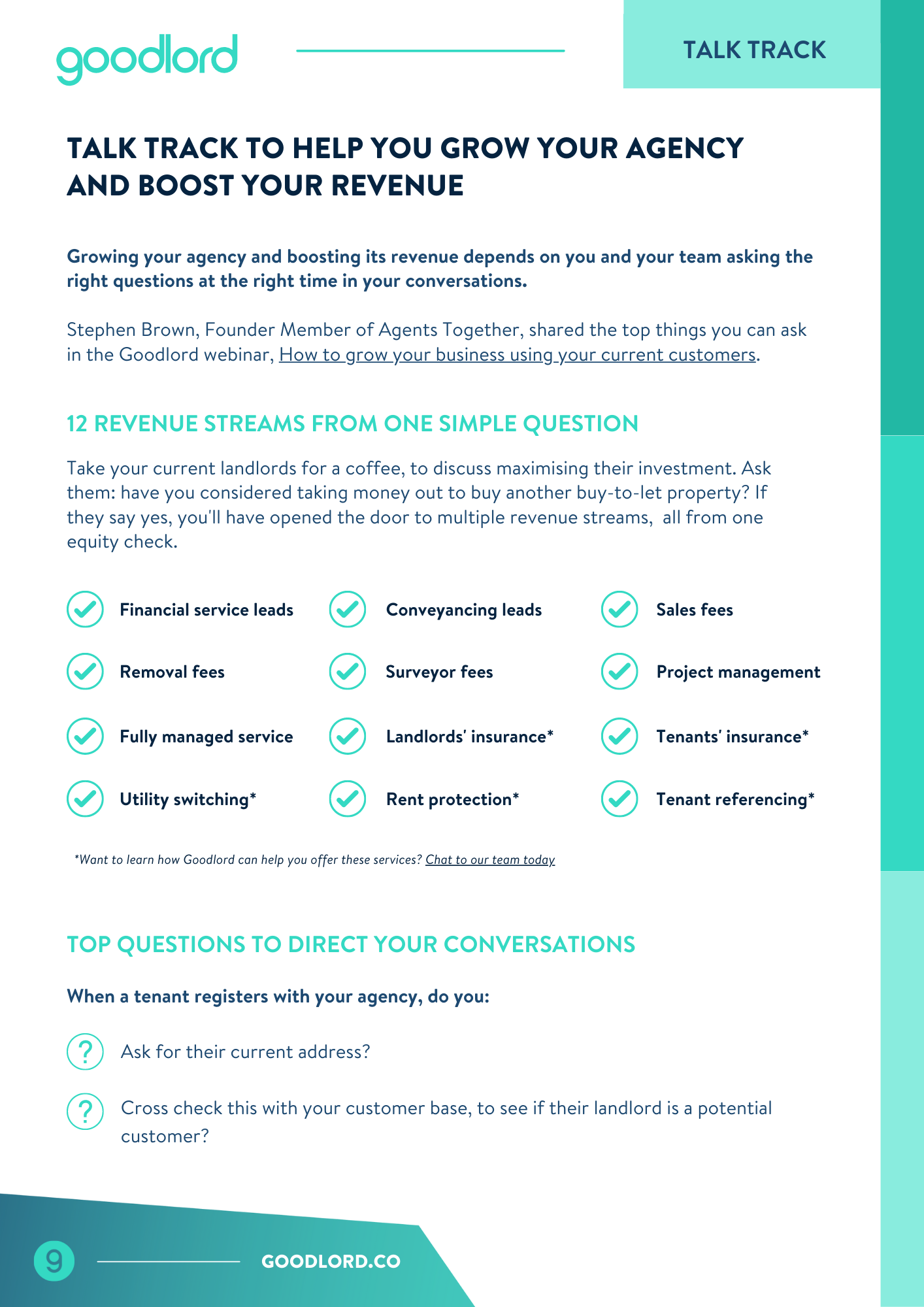 Use this talk track template to help direct your conversations in sales and lettings, grow your agency's portfolio, and boost your revenue.