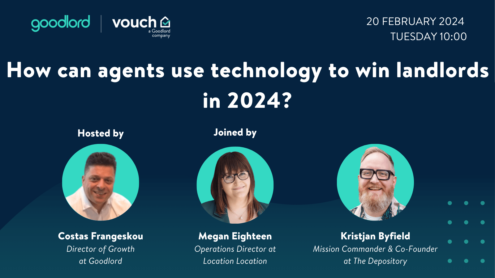 Join Costas Frangeskou, Goodlord’s Director of Growth, as he hosts a discussion with Megan Eighteen Operations Director at Location Location, and Kristjan Byfield, Mission Commander & Co-Founder at The Depository. They’ll go through the importance of staying ahead of the curve with technology - and what tenant and landlords expectations are in 2024.