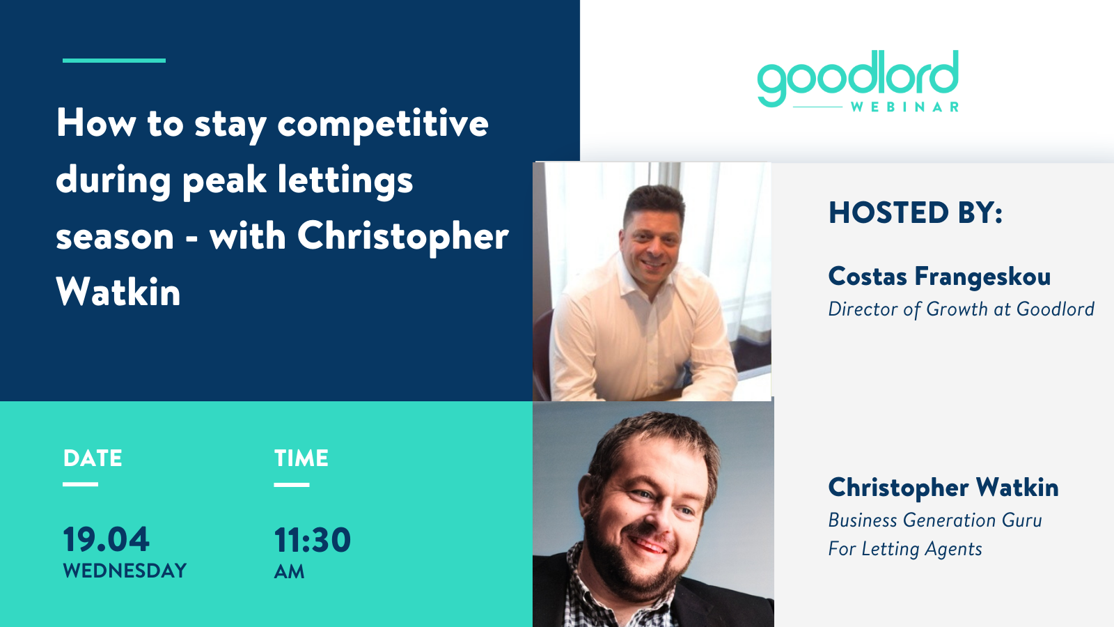 Christopher Watkin, Business Generation Guru for letting agents, will join Costas Frangeskou, Goodlord's Director of Growth, to share his expertise around best practices for your agency business, how to get ready for the busiest time of the year - and how you can win landlords, even while stock is low.