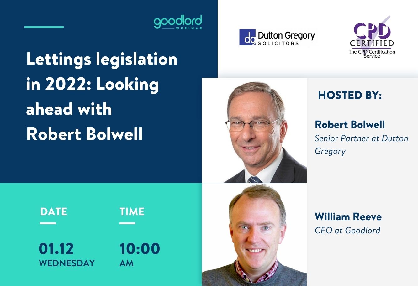 How will changes in lettings legislation impact your agency in 2022? Get your questions answered live by ARLA Propertymark's Robert Bolwell, Senior Partner at Dutton Gregory, at the next Goodlord webinar.