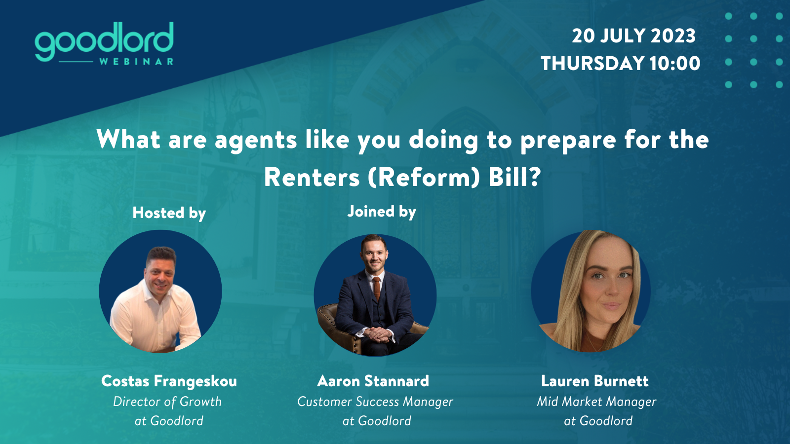With over 45 years of combined lettings experience, alongside best practice learnt from over 7,000 agencies, our Goodlord experts, Costas Frangeskou, Director of Growth, Lauren Burnett, Mid Market Manager and Aaron Standard, Customer Success Manager will share tips on how agents are approaching their future challenges and opportunities right now in preparation for the Renters (Reform) Bill.