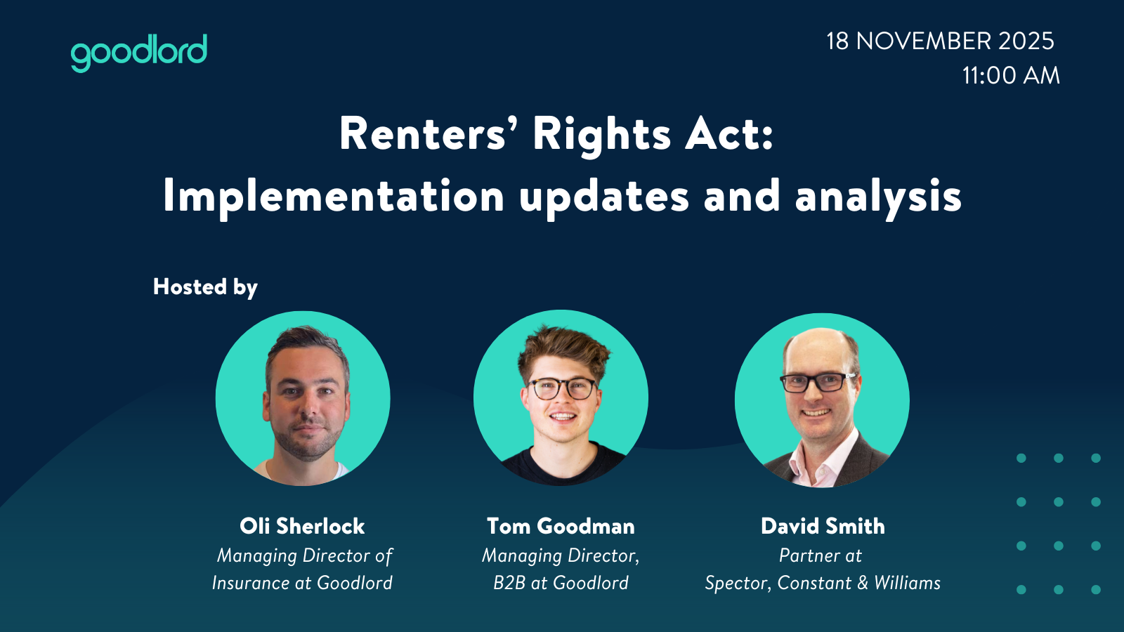 Hear from our expert guest, David Smith, Partner at Spector, Constant and Williams, to give you practical advice to put your agency on the front foot and Goodlord's RRA powerhouses Oli Sherlock, Director of Insurance, and Tom Goodman, Managing Director of B2B.