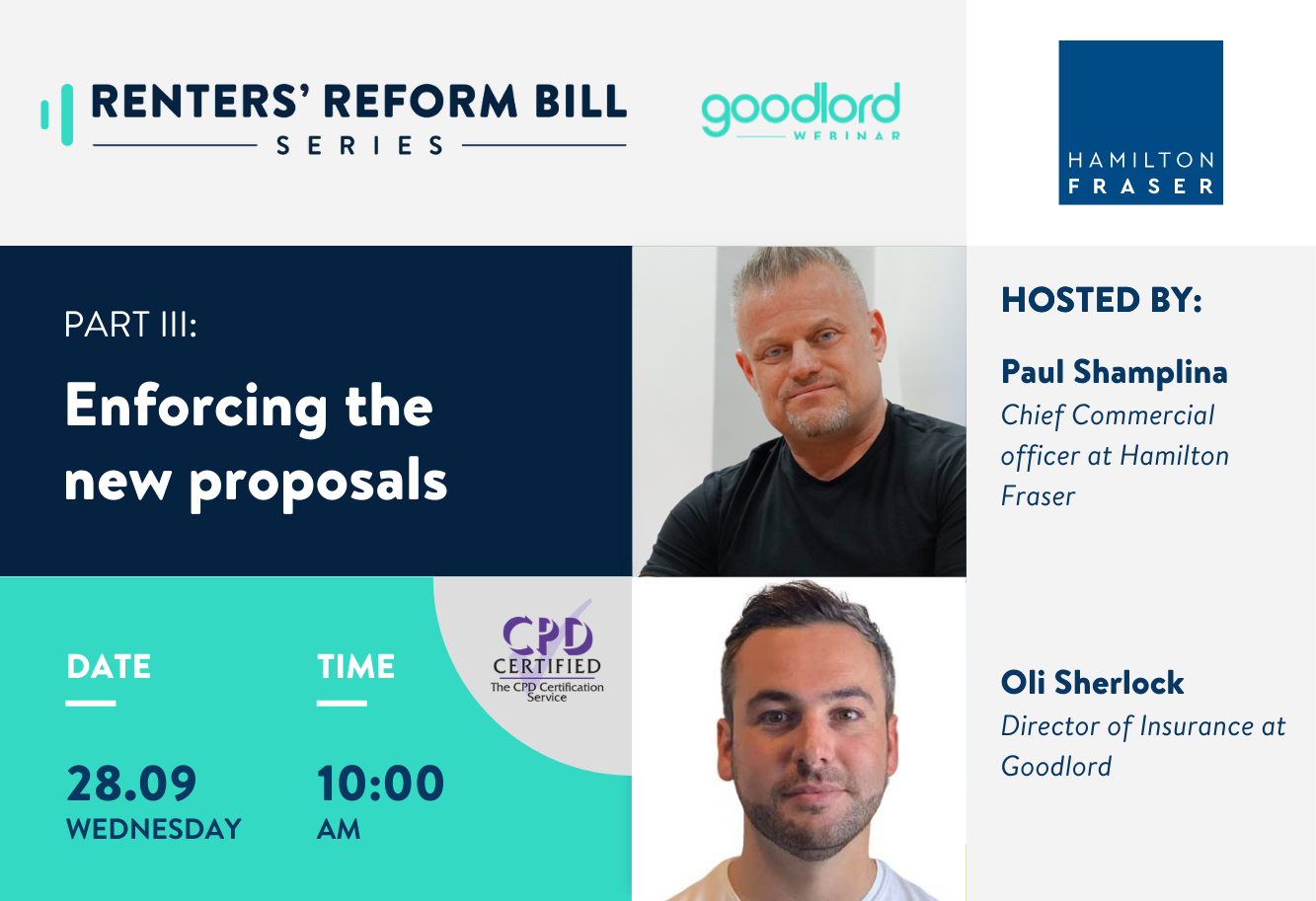 The government has suggested several new routes to enforcement, including housing court reforms, an Ombudsman covering all private landlords, and the introduction of a property portal to improve compliance. Paul Shamplina, Chief Commercial Officer at Hamilton Fraser, joins series' host Oli Sherlock, Director of Insurance at Goodlord, to discuss how the proposals could be enforced.